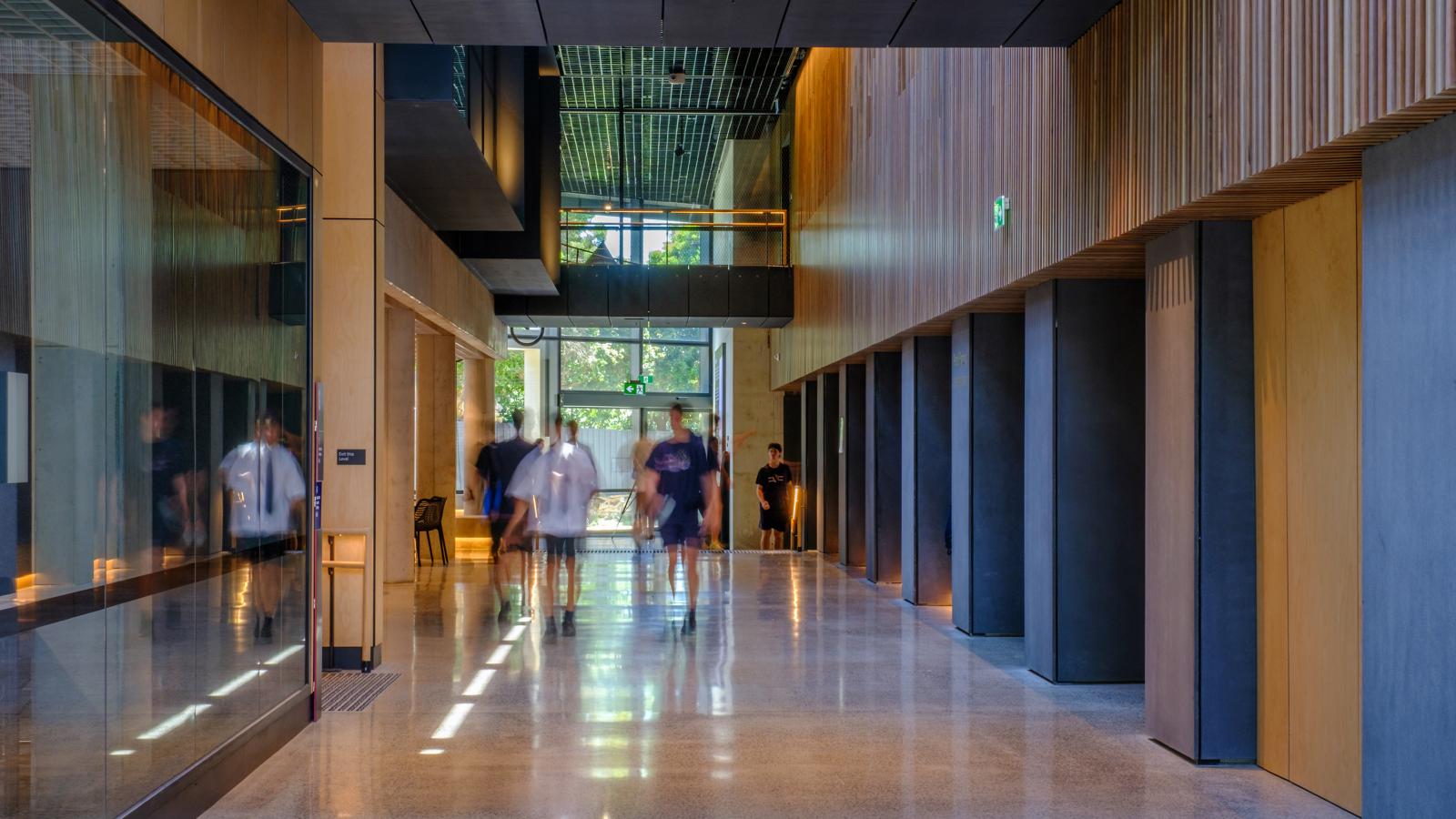 Upon entering The Duigan Centre, students and visitors are welcomed by a striking open space that reflects the school’s forward-thinking approach to education. This dynamic thoroughfare offers clear visibility through glass windows, enhancing the sense of openness and connection throughout the centre. A Learning Lane leads to an expansive café that doubles as a collaborative learning hub, with open-plan seating areas designed for informal study and discussion.
