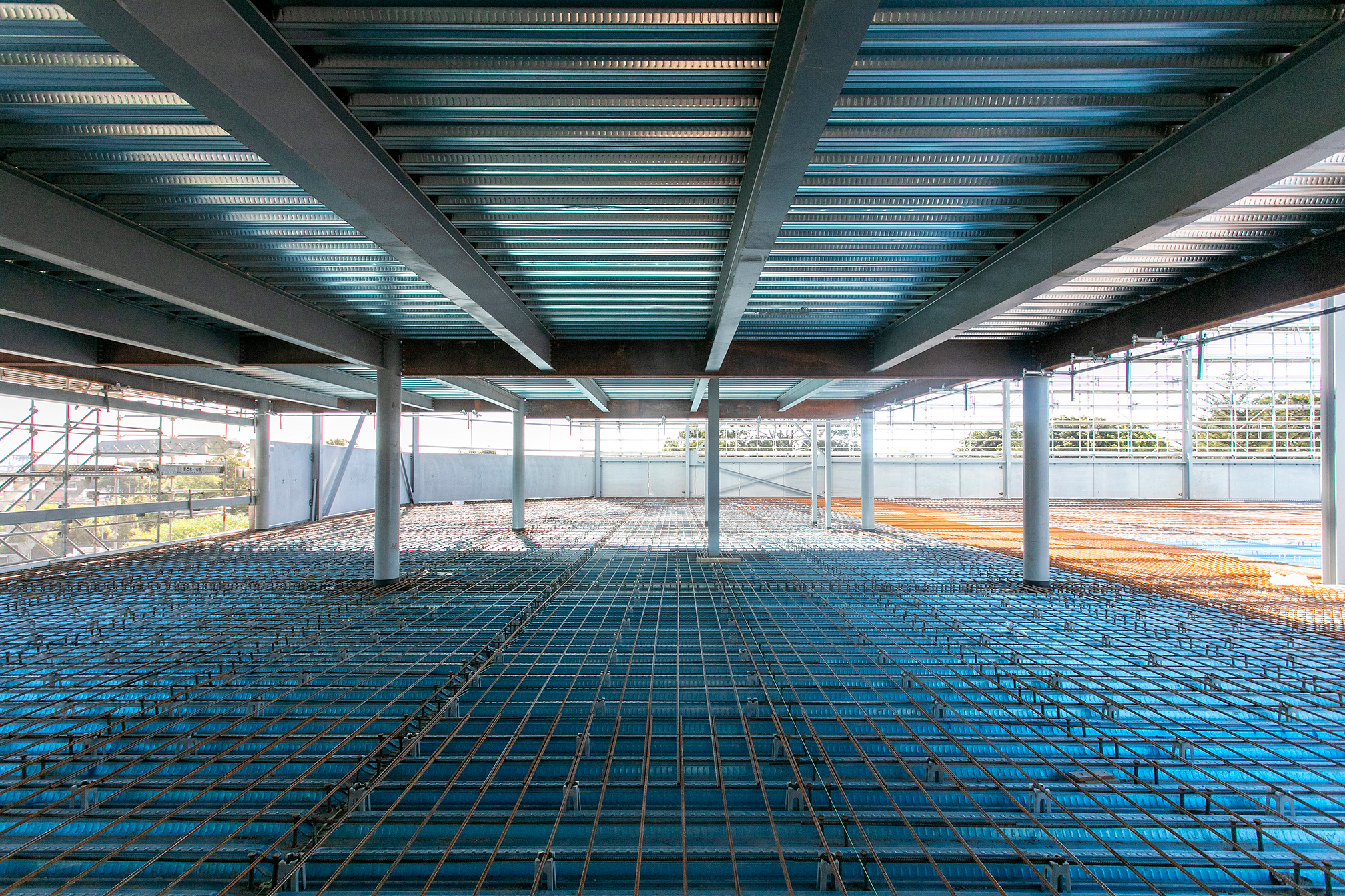 Precast concrete columns have been installed in both warehouses while bondeck has been installed to the level one suspended slab in the southern warehouse. Stud welds have also been installed and the team are laying reinforcements in preparation to pour.