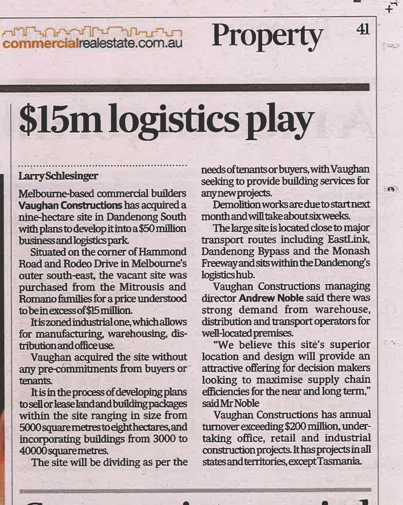 Melbourne-based commercial builders Vaughan Constructions has acquired a nine-hectare site in Dandenong South with plans to develop it into a $50 million business and logistics park.