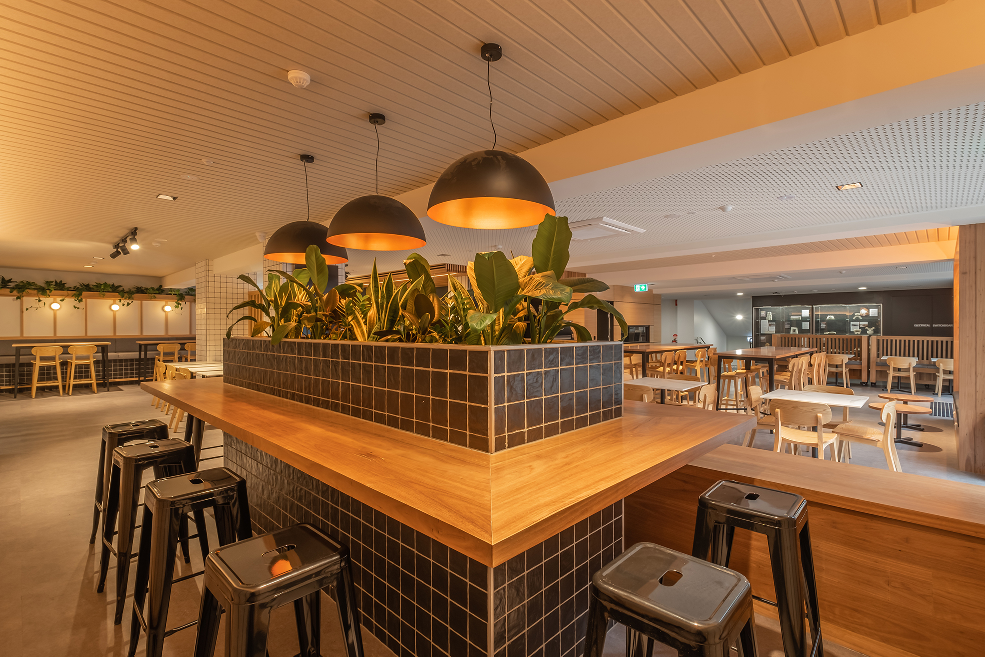 Front of house areas include Quantum Quartz benchtops, LED displays, and feature timber battened ceilings. The seating area includes high quality finishes, feature walls, communal dry bar tables and banquette seating.