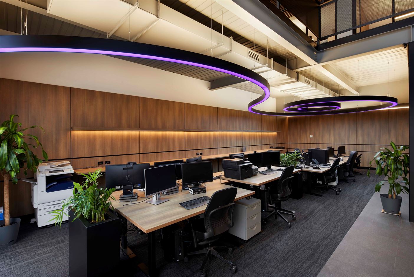 The lighting is the key focal point in every space, with the entire facility acting as a showroom to showcase Darkon’s innovative lighting products. Highlights include the stunning chandelier in the entry and the swirling colour-changing statement light in the ground-floor office.