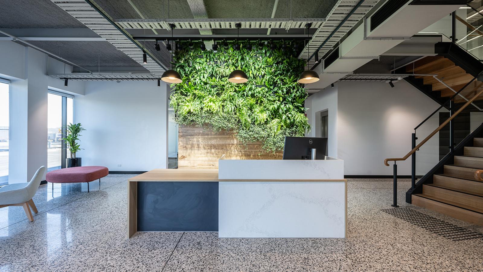 The BWX facility includes sustainability initiatives such as general, co-mingle and organics bins to all lunchroom and kitchenette areas, a PV solar system, a vertical green wall at the reception area, application of Envirspray to exposed office ceiling as well as LED lighting throughout.