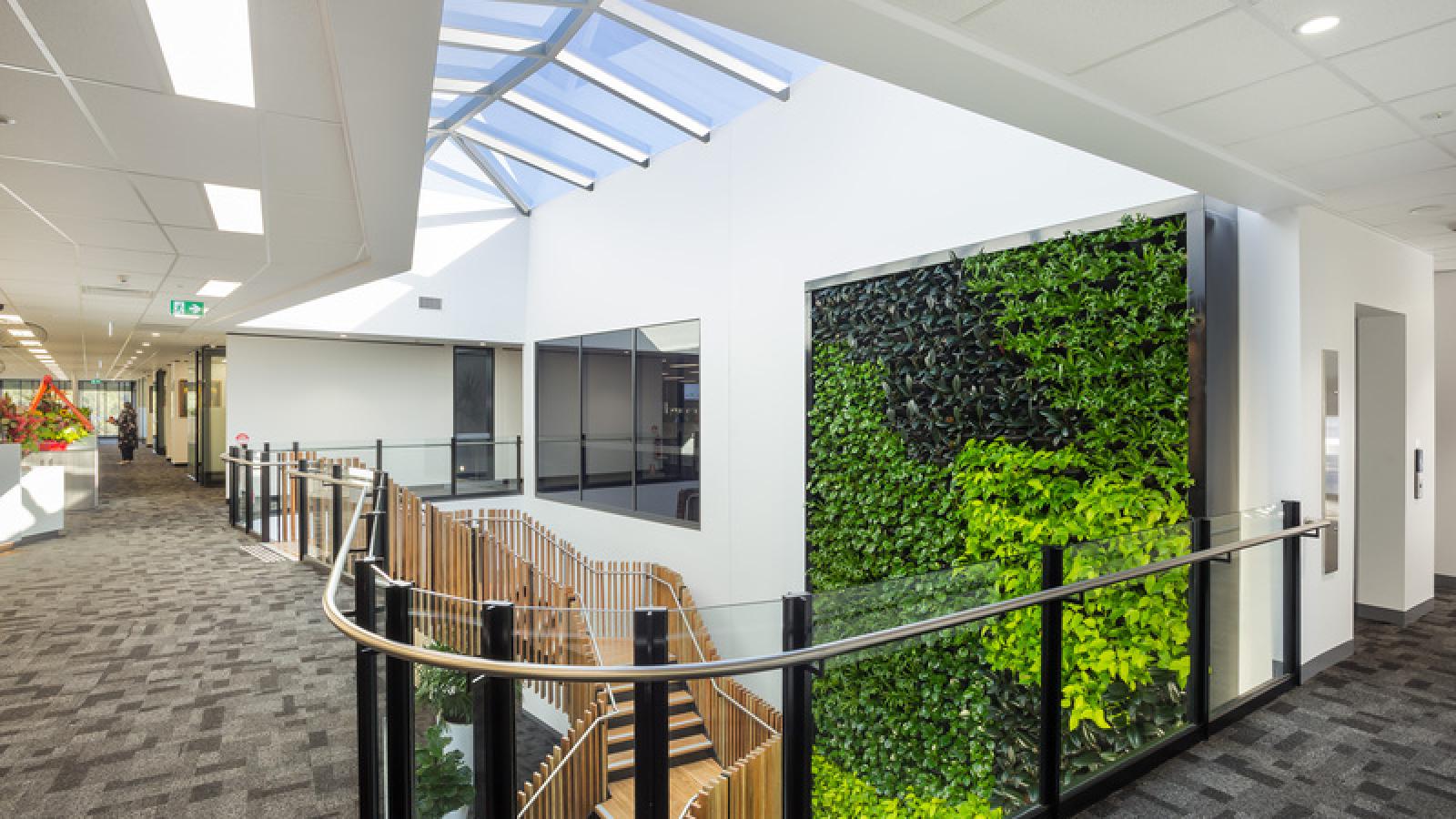 With sustainability at the forefront, the design incorporates many ‘green’ initiatives, which are metred and results are projected onto a BMS screen in the reception area for staff and visitors to view. Some key initiatives include a recycled water collection system, light harvesting and a 365 panel 100KW solar system on the roof to supplement power usage.