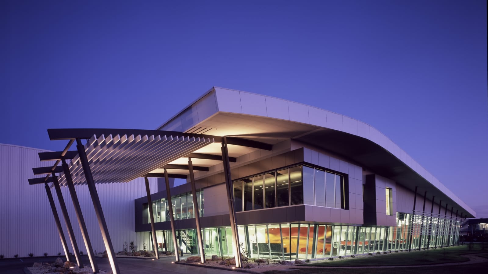 The stunning office has a large aerofoil roof over two story high campus style office space. An internal courtyard invites an abundance of natural light to all areas of the office and laboratory areas.