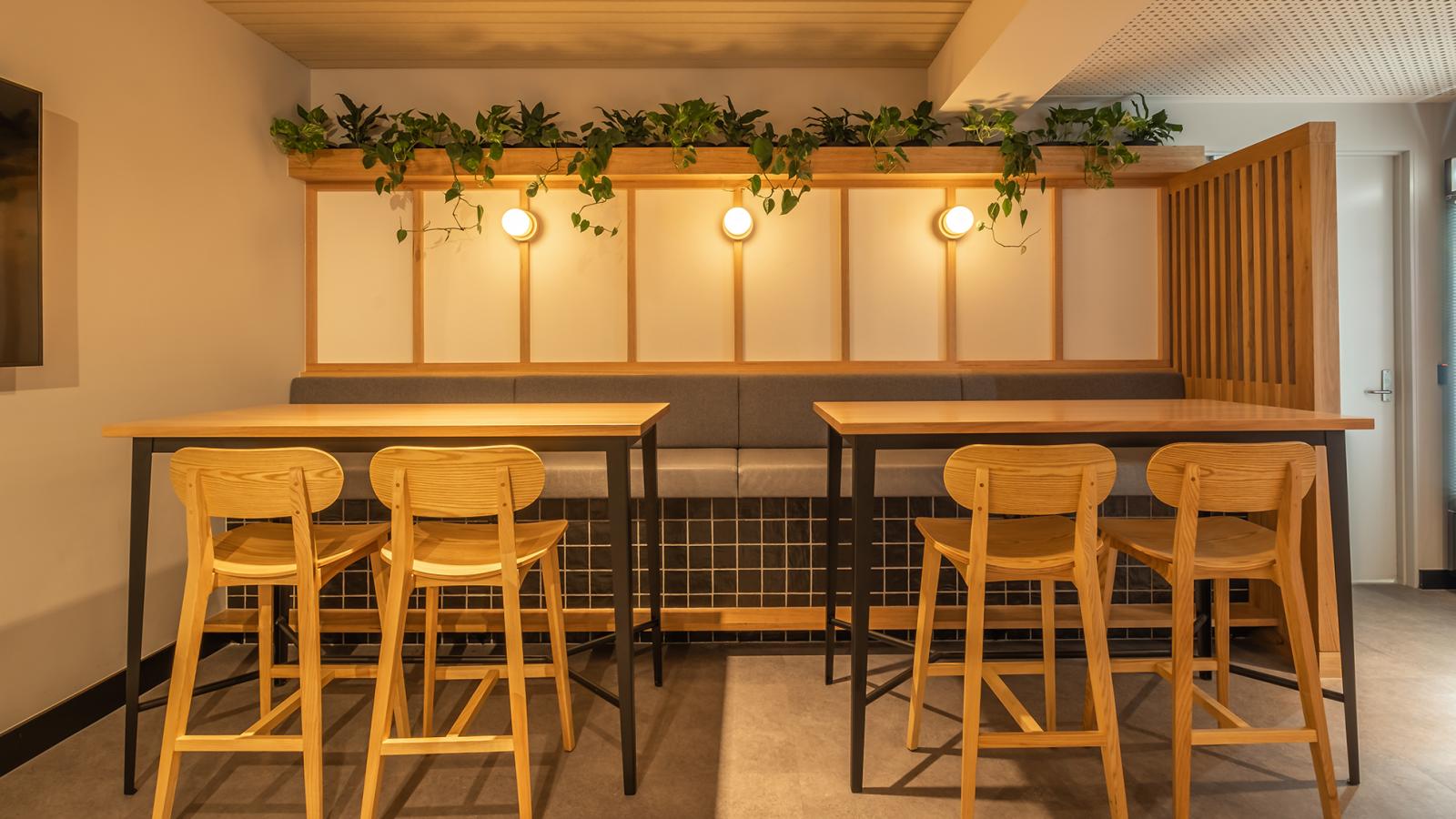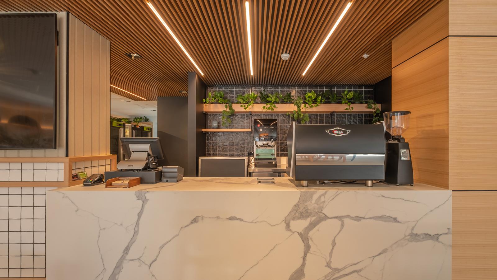 Front of house areas include Quantum Quartz benchtops, LED displays, and feature timber battened ceilings. The seating area includes high quality finishes, feature walls, communal dry bar tables and banquette seating.